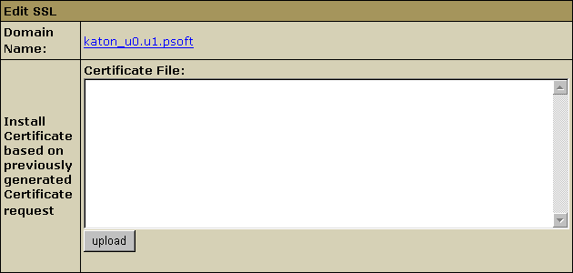 14. In the form that opens, enter the SSL certificate into the box Install Certificate based on previously generated Certificate request and click Upload:
