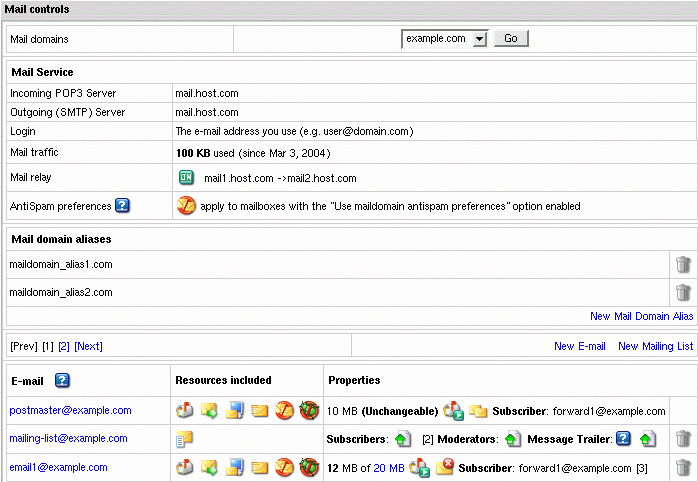 - [Prev] [1] [2] ... [Next] navigation links (appear if there are more than 10 mail resources on the maildomain)