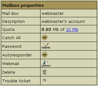 • Quota: change the quota for this specific mailbox. Mailbox quota is not related to the site disk space quota. To change your mail quota, enter its new size in megabytes. From that moment on you will be charged for the difference between this new amount and the default free amount. This charge will be added to the recurrent fee at the beginning of each billing period.