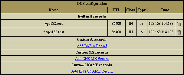 - Select VPS DNS Zone in the Virtual Private Server menu. The following page shows: